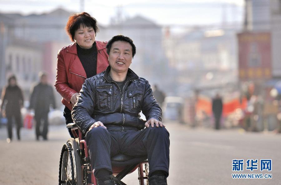 一個妻子不離不棄的感人故事,在安徽省舒城縣曉天鎮(zhèn)幾乎家喻戶曉。 2006年初夏,曉天鎮(zhèn)街道的汪世俊在安裝廣告牌時,不幸從腳手架上摔了下來,造成下肢癱瘓。妻子張先琴始終不離不棄,8年如一日,未曾走過親戚,出過遠門。丈夫癱瘓后的頭3年里,每隔半個鐘頭就要翻一次身,還需要及時更換尿布,張先琴沒有睡過一個安穩(wěn)覺。為了防止肌肉萎縮,張先琴想辦法將繩子系在丈夫腰間,協(xié)助他進行康復訓練。從一個健全人變成殘疾人,巨大的心理落差使汪世俊脾氣變得暴躁,他常常發(fā)無名火,可每每這時,張先琴總能默默忍受。張先琴說:丈夫能有說有笑,沒有失去生活的信心,這比什么都重要。 新華社發(fā)(呂務農(nóng) 攝)