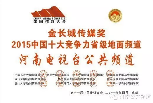 河南公共頻道報(bào)榮獲“金長(zhǎng)城傳媒獎(jiǎng)·2015年中國十大競(jìng)爭(zhēng)力省級(jí)地面頻道”榮譽(yù)。