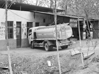一輛油罐車正在給一處非法加油點(diǎn)送油