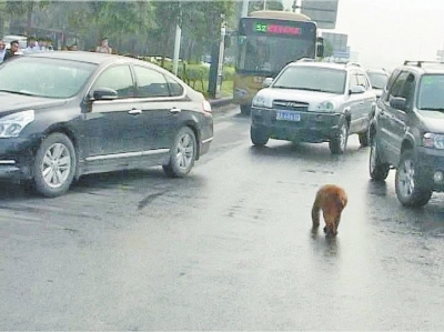 記者隨后致電鄭州市林業(yè)局野生動(dòng)物救護(hù)站求助。在等待的過(guò)程中,這只“美猴王”引來(lái)不少市民圍觀,有市民拿出手機(jī)靠近拍照,“美猴王”猛地躥出,嚇得拍照的市民連退幾步。見(jiàn)人群漸多,“美猴王”坐不住了,跑到了商都路的快車道上,過(guò)往車輛見(jiàn)狀紛紛躲避(如圖),幾位巡防隊(duì)員在后面跟著,提醒車輛注意,但跟得緊了,“美猴王”還一度回過(guò)身來(lái),試圖撲咬巡防隊(duì)員。