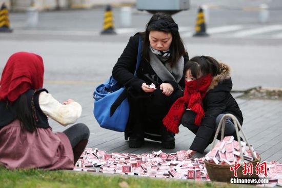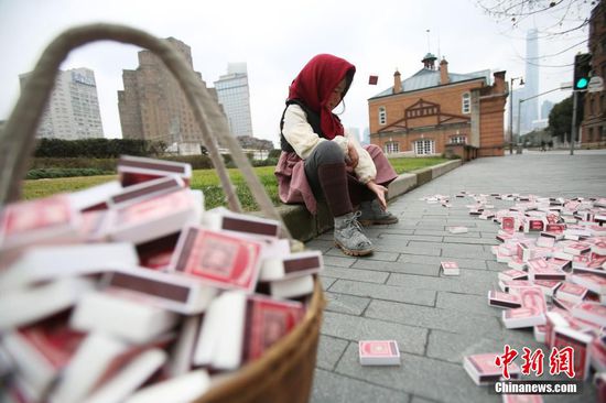 1月12日,上海外灘街頭出現(xiàn)一位小女孩,她身穿古典長(zhǎng)裙,頭裹赭紅色圍巾,挎著裝滿火柴的小竹籃,在寒風(fēng)中向過往的路人送小火柴。據(jù)了解,這是一次“愛心衣櫥”幫助中國山區(qū)孩子擺脫寒冷的愛心募捐活動(dòng)。在寒冷的冬天,他們嘗試以“賣火柴的小女孩”活動(dòng),喚起社會(huì)的關(guān)注,把更多的溫暖傳遞到中國山區(qū)寒冷孩子的手上。只要掃一掃火柴盒上的二維碼,就可以立刻向山區(qū)孩子送上一套溫暖新衣。張亨偉 攝