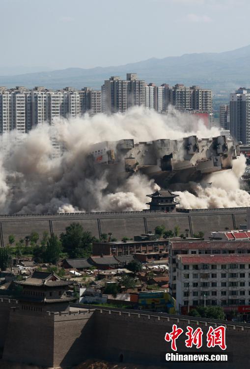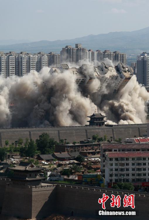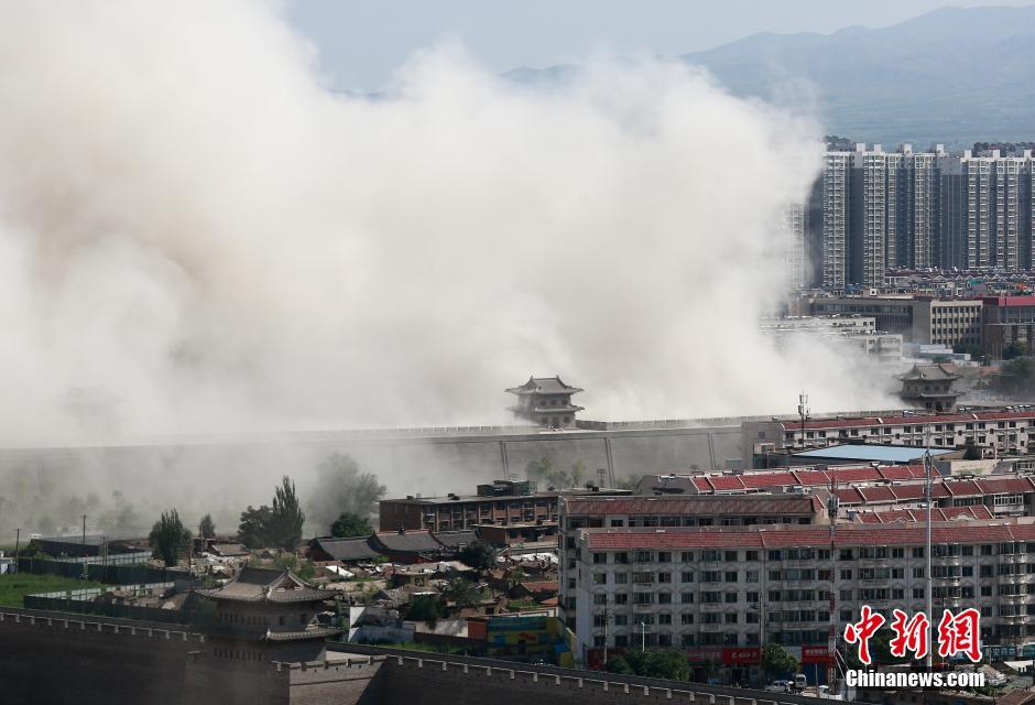 8月8日,山西大同,當?shù)卣畬ξ挥诒背菈ξ涠ㄎ鏖T外的一座90米高的大樓實施爆破拆除,飛揚的塵土與古城墻呼應形成壯觀場面。由于該樓位置與古城保護規(guī)劃有所沖突,當?shù)卣畬ζ鋵嵤┍疲源思涌旃懦堑谋Wo與復興。 楊榮 攝