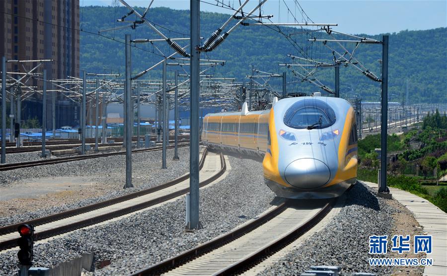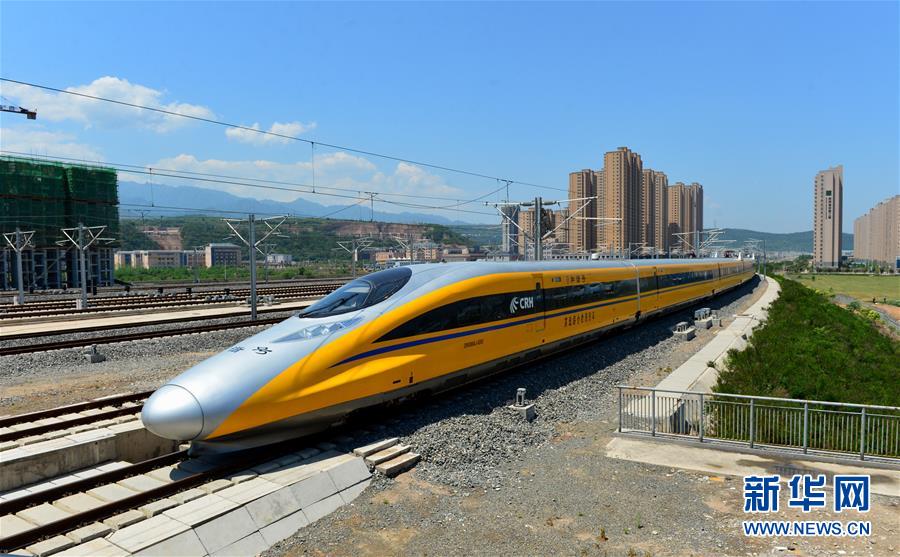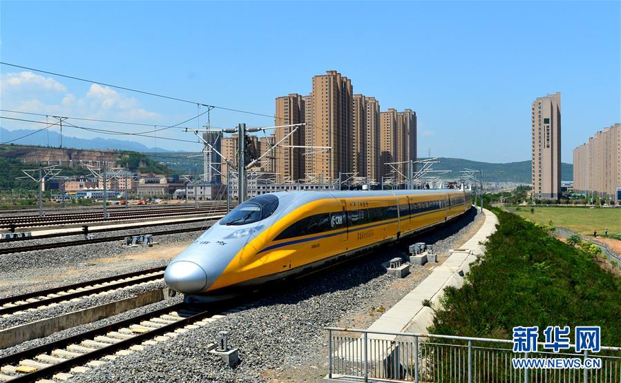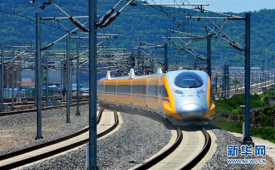 在陜西寶雞,一列高速綜合檢測(cè)列車在寶蘭高鐵上行駛(5月16日攝)。