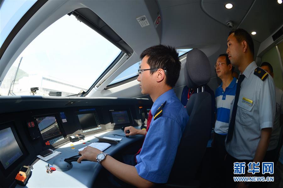 技術(shù)人員在寶蘭高鐵高速綜合檢測(cè)列車司機(jī)室作業(yè)(5月16日攝)。