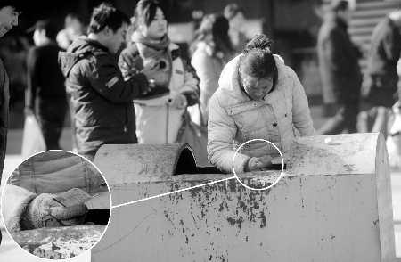 昨日上午11時(shí)許,在鄭州火車站北出站口旁,一名穿藍(lán)色棉襖的女子一直站在垃圾桶旁邊,手拎著裝有塑料瓶的黑色袋子,見(jiàn)人扔?xùn)|西就盯著人家的手。
