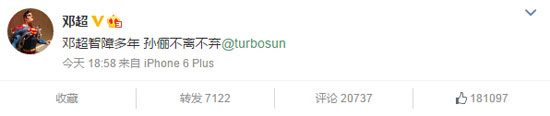 2015年3月30日,鄧超發(fā)表微博稱:“鄧超智障多年,孫儷不離不棄?!标P(guān)心孫儷和鄧超二人的網(wǎng)友們瞬間圍觀。網(wǎng)友們徹底被鄧超這個段子手所打敗了:“說的好有道理,我竟無言以對。”