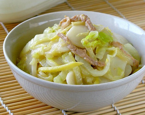 這白菜肉絲炒年糕大概每個(gè)上海煮婦都做上過幾回吧,天冷的時(shí)候,大棵的白菜囤起來,切兩根年糕,撒點(diǎn)肉絲,調(diào)味簡簡單單,少許鹽和醬油點(diǎn)個(gè)味就行。說是炒年糕,其實(shí)是半湯的,有少許濃稠的湯汁在里頭,年糕軟糯,吸收著大白菜和肉絲的湯汁,吃一小碗就暖心暖胃。
