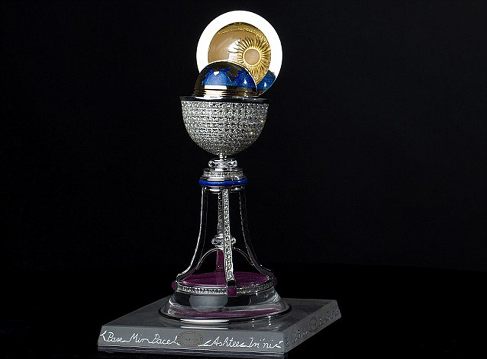 打開“幻影蛋”蛋殼后,可以看到里面裝飾華麗的迷你地球儀。將地球儀頂端提起,里面是用無色水晶雕成的白鴿,棲息在黃金橄欖枝上,還有黃金手工雕刻的“世界和平”字樣。這個“幻影蛋”是精英工匠歷時3年方才打造完成的。
